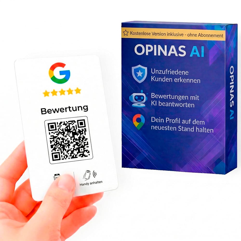 Mit unseren NFC- und QR-Ständern und -Karten hinterlassen Kunden in Sekunden Bewertungen. Außerdem erhalten Sie kostenlosen Zugang zur OPINAS-App, um negative Stimmen zu filtern und mit KI zu antworten.
