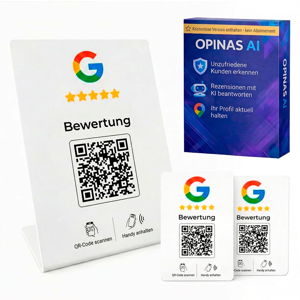 Im Gegensatz zu anderen Bewertungs-Ständern ist der Google Bewertungen Aufsteller mit NFC & QR Code auf Deutsch mit der OPINAS-App verbunden, die Kontrolle, Verfolgung und Automatisierung hinzufügt.