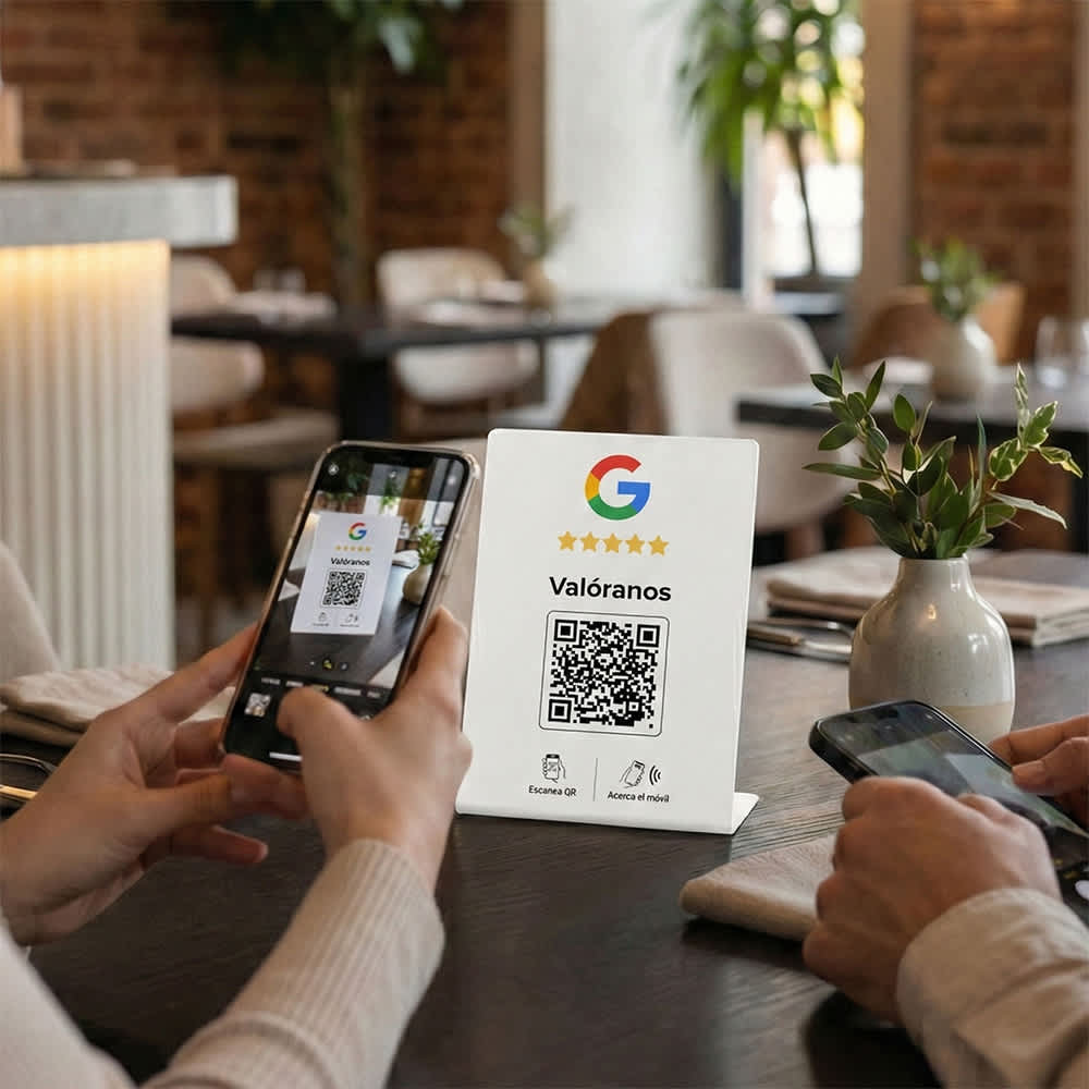 El soporte de reseñas en Google con NFC y QR facilita que cualquier cliente pueda dejar su opinión en segundos. Puede elegir entre acercar su móvil o escanear el código QR, eliminando barreras y aumentando la participación.