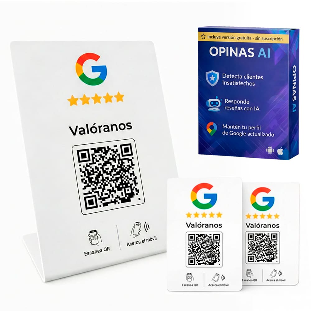 A diferencia de otros carteles de reseñas, el stand de reseñas Google con NFC + QR está conectado a la aplicación de OPINAS, lo que añade control, seguimiento y automatización.