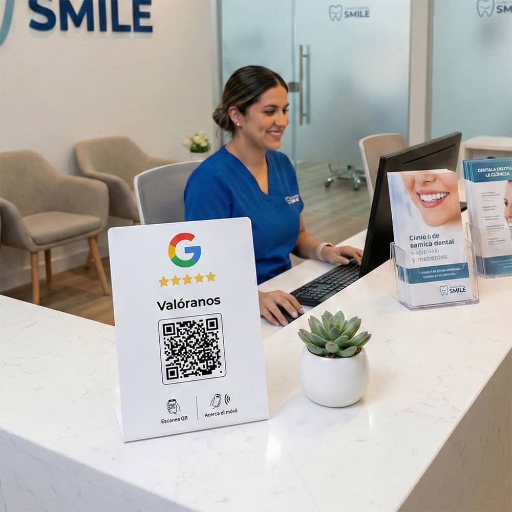 El cartel expositor de reseñas en Google con NFC y QR colocado en el mostrador, mesas o recepción permite que cualquier cliente acceda a la página de reseñas de tu negocio en segundos.