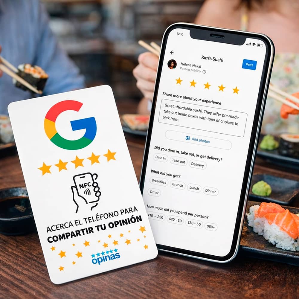 Las tarjetas NFC para reseñas en Google son útiles para cualquier negocio con atención presencial y que disponga de un perfil de empresa en Google. Especialmente eficaces en restaurantes, clínicas, hoteles, gimnasios, comercios y centros de servicios, donde los clientes pueden dejar su opinión justo después de recibir el servicio. Esto ayuda a mejorar la reputación online y el posicionamiento en Google Maps.