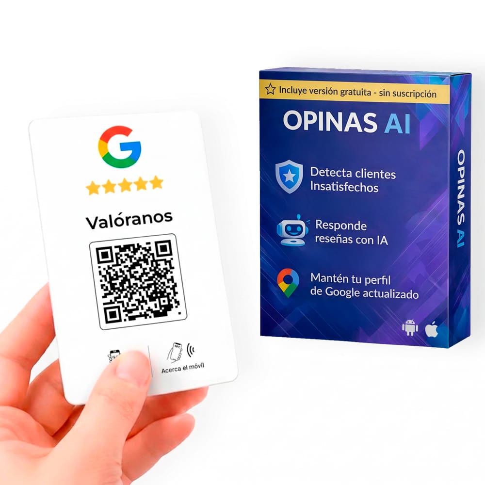 Con nuestros stands y tarjetas NFC & QR, tus clientes dejan reseñas en segundos. Además, accedes gratis a la app de OPINAS para filtrar opiniones negativas y responder reseñas con IA.