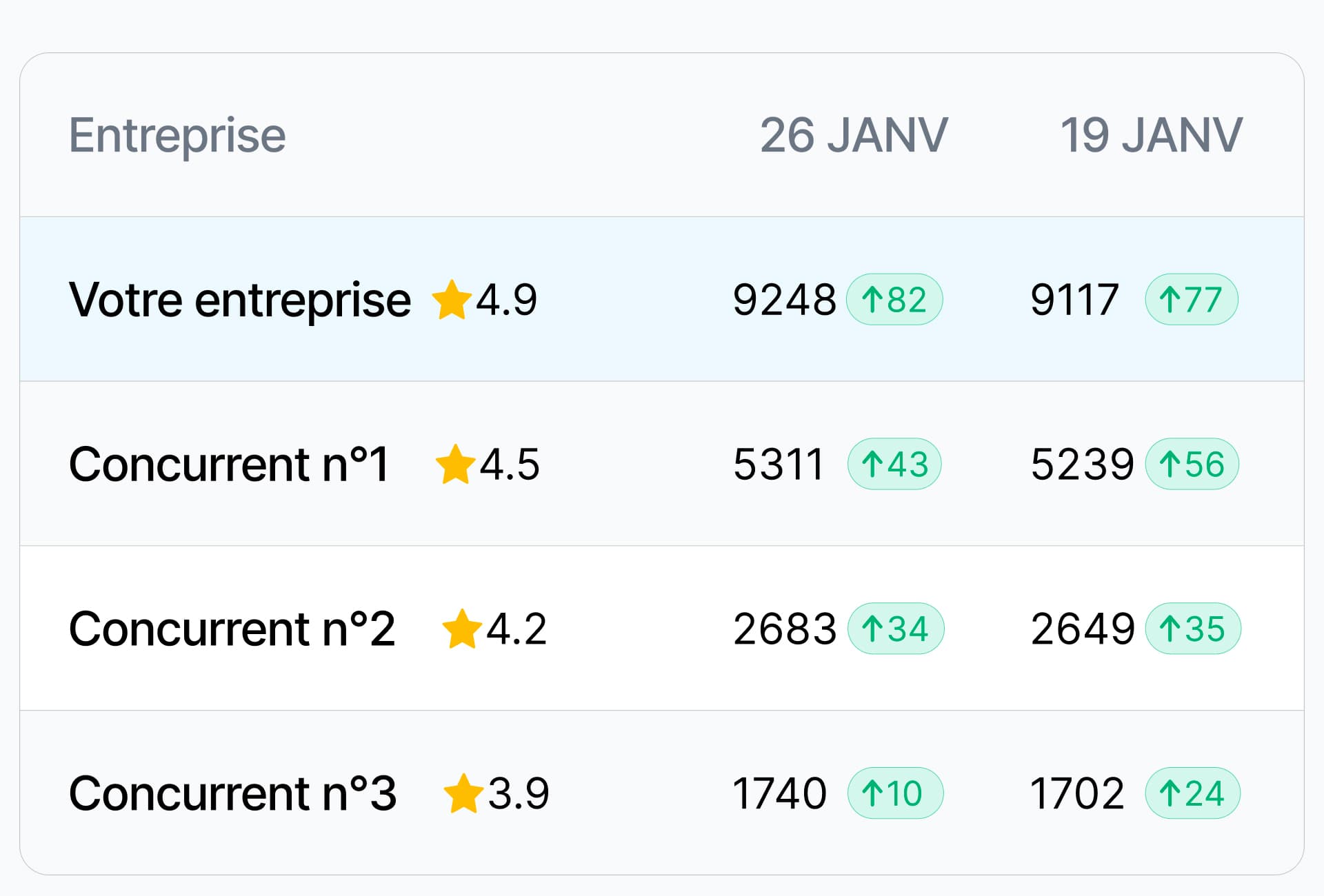 Surveillez les concurrents et comparez l'évolution de votre note avec d'autres établissements dans votre zone ou secteur pour fixer des objectifs.