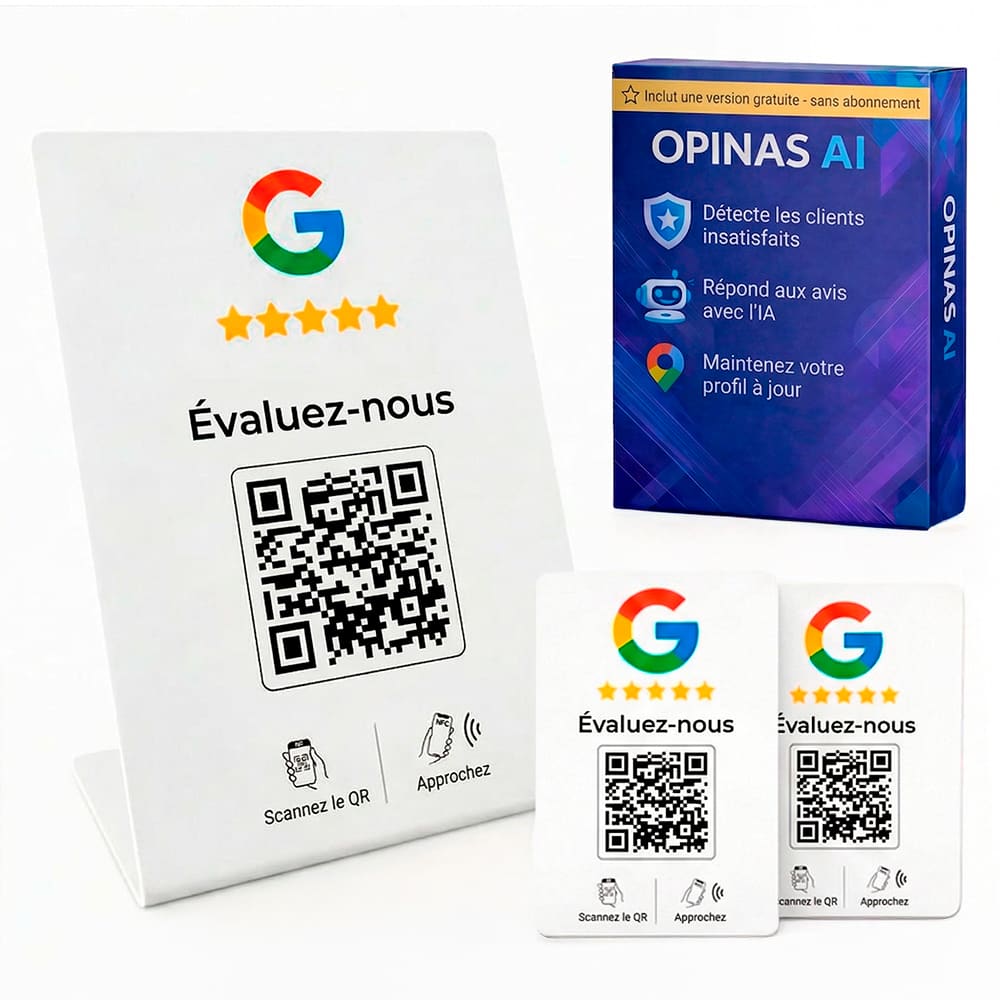 Contrairement à d'autres supports avis, le Plaque avis Google NFC & QR code Française est relié à l'app OPINAS, qui ajoute contrôle, suivi et automatisation.