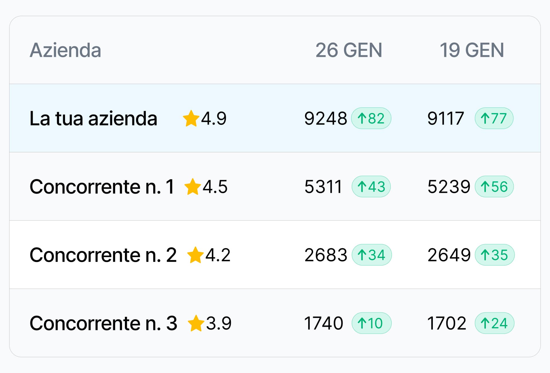 Monitora i concorrenti e confronta l'evoluzione del tuo punteggio con altre attività nella tua zona o settore per fissare obiettivi.