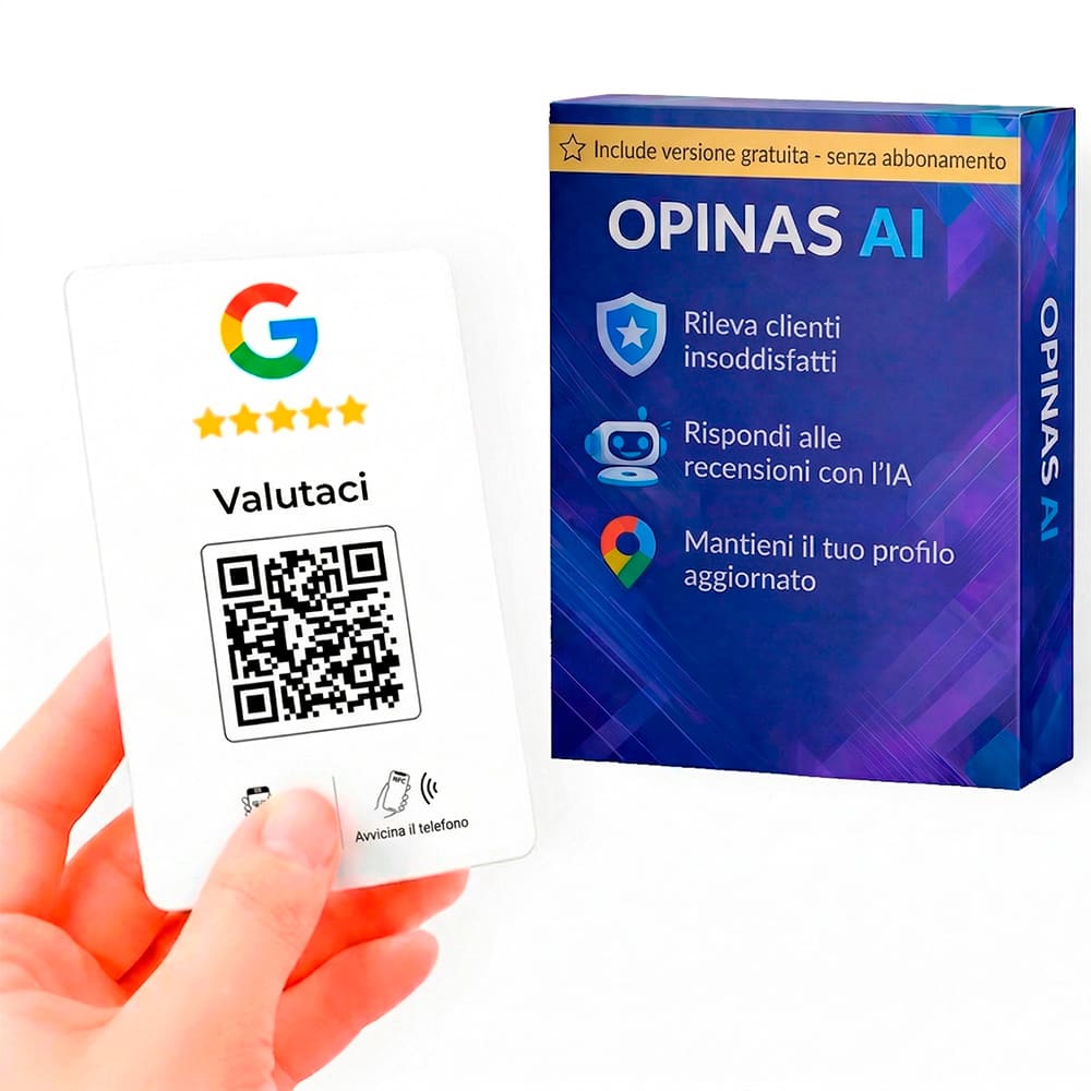 Con stand e carte NFC e QR, i clienti lasciano recensioni in pochi secondi. Hai anche accesso gratuito all’app OPINAS per filtrare il feedback negativo e rispondere con l’IA.