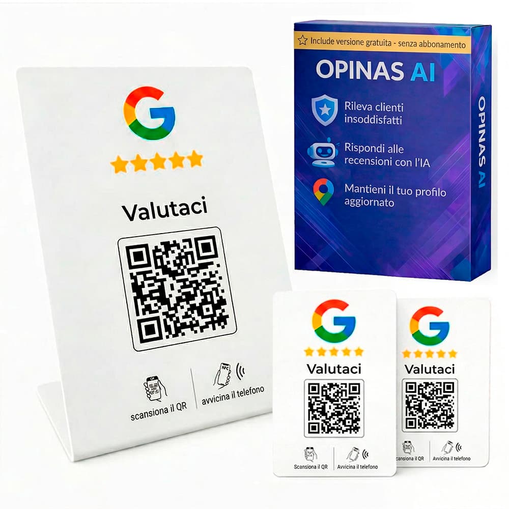 A differenza di altri cartelli recensioni, il Stand Espositore per Recensioni Google NFC e QR Italiano è collegato all'app OPINAS, che aggiunge controllo, tracciamento e automazione.